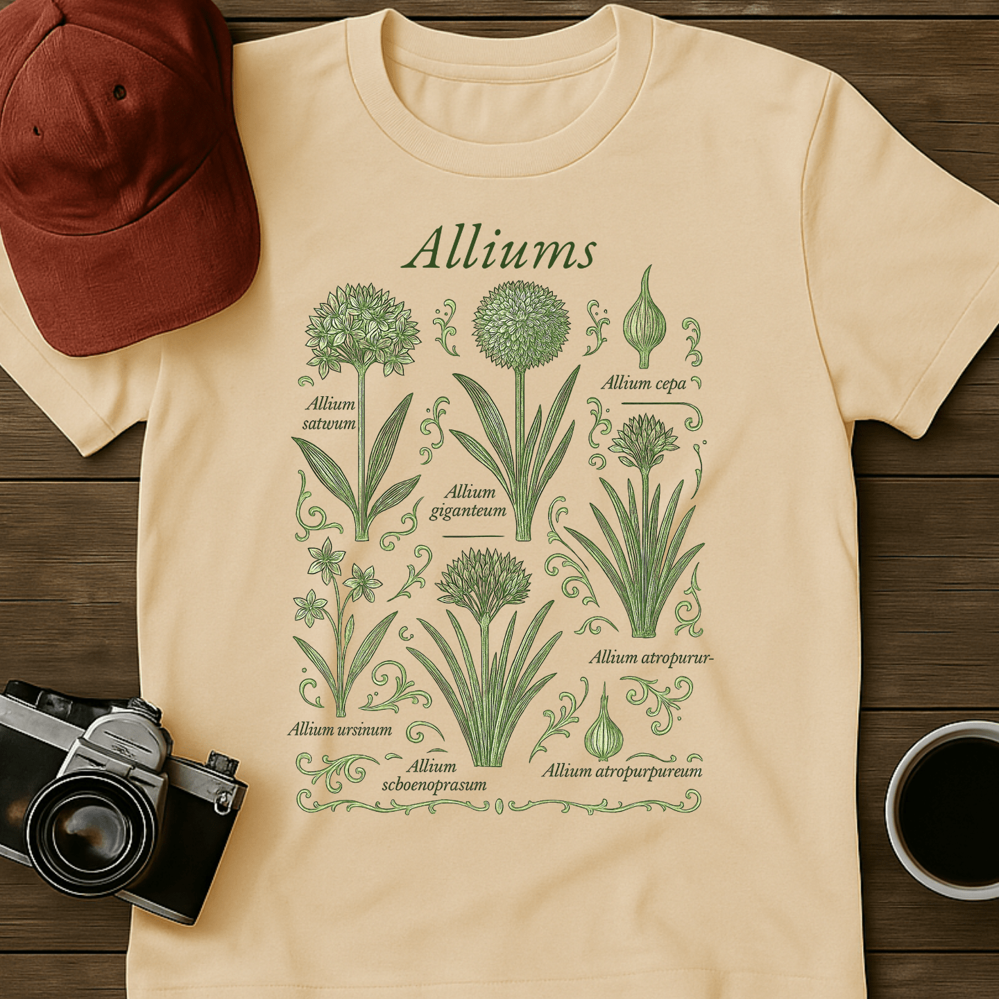 "Alliums T-Shirt" is a Rooted & Worn original design printed on a premium "softstyle" tee celebrating the difficult but rewarding ritual of gardening and the joy that homegrown plants add to our lives.