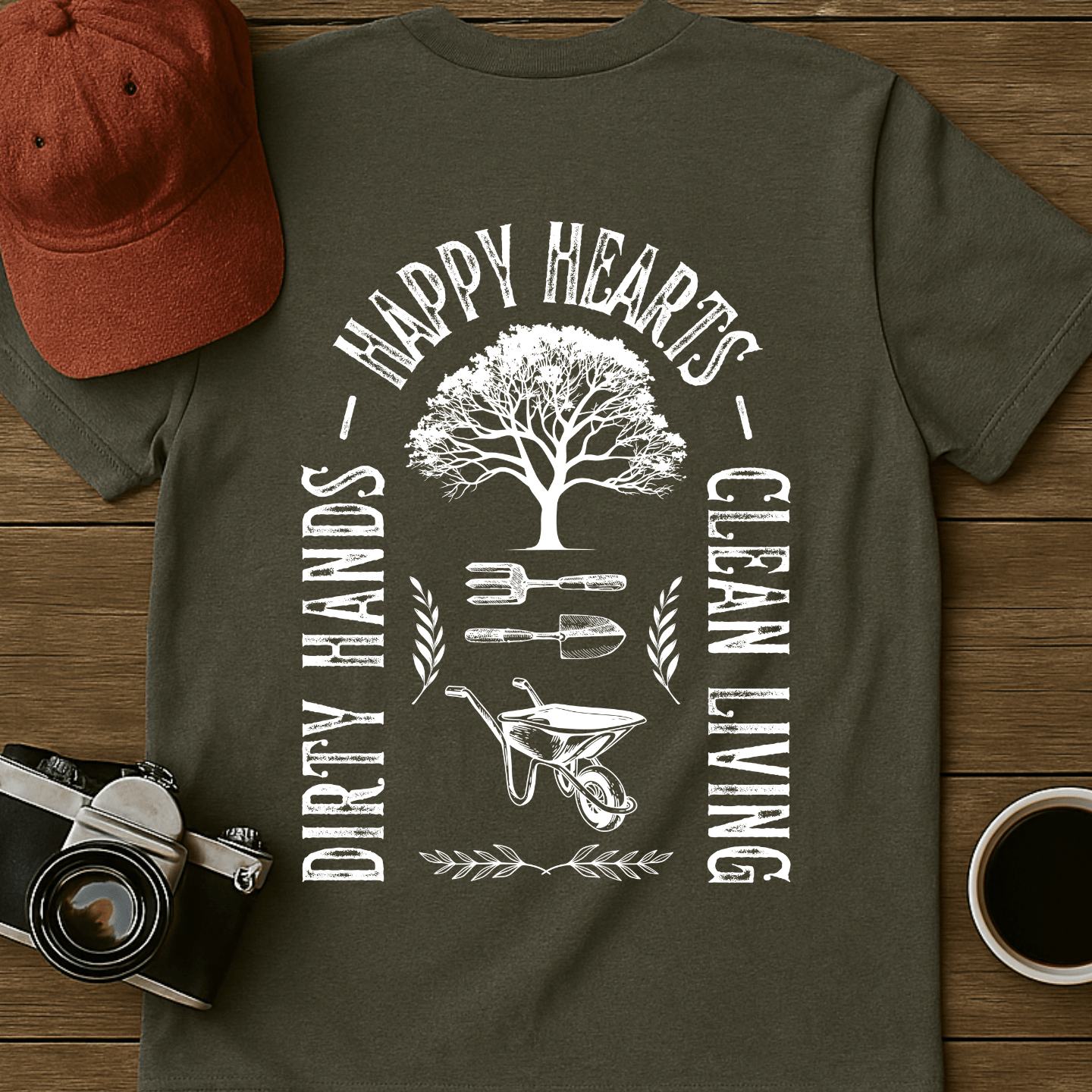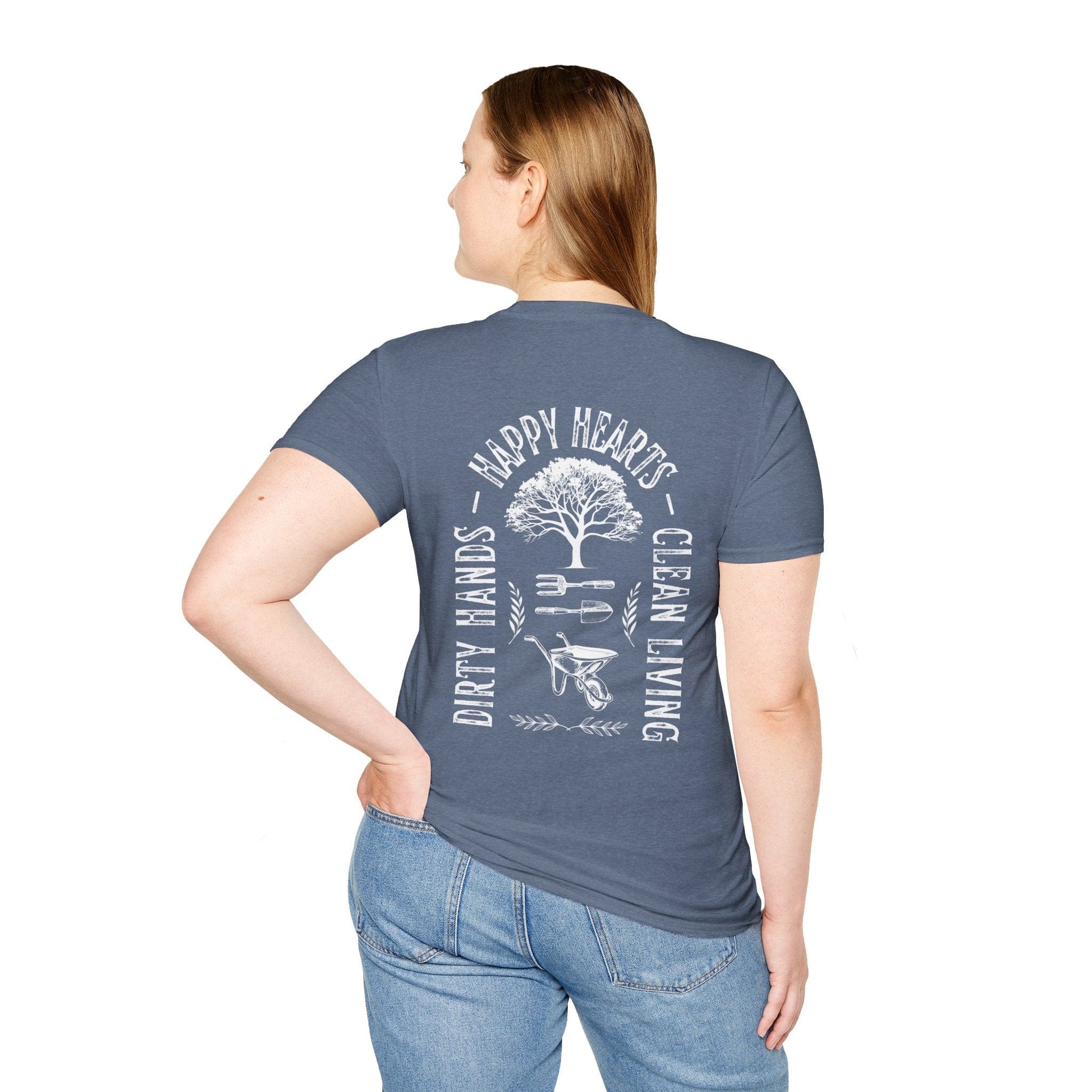 "Clean Living Garden T-Shirt (BACK)" is a Rooted & Worn original design printed on a premium "softstyle" tee celebrating the difficult but rewarding ritual of gardening and the joy that homegrown plants add to our lives.