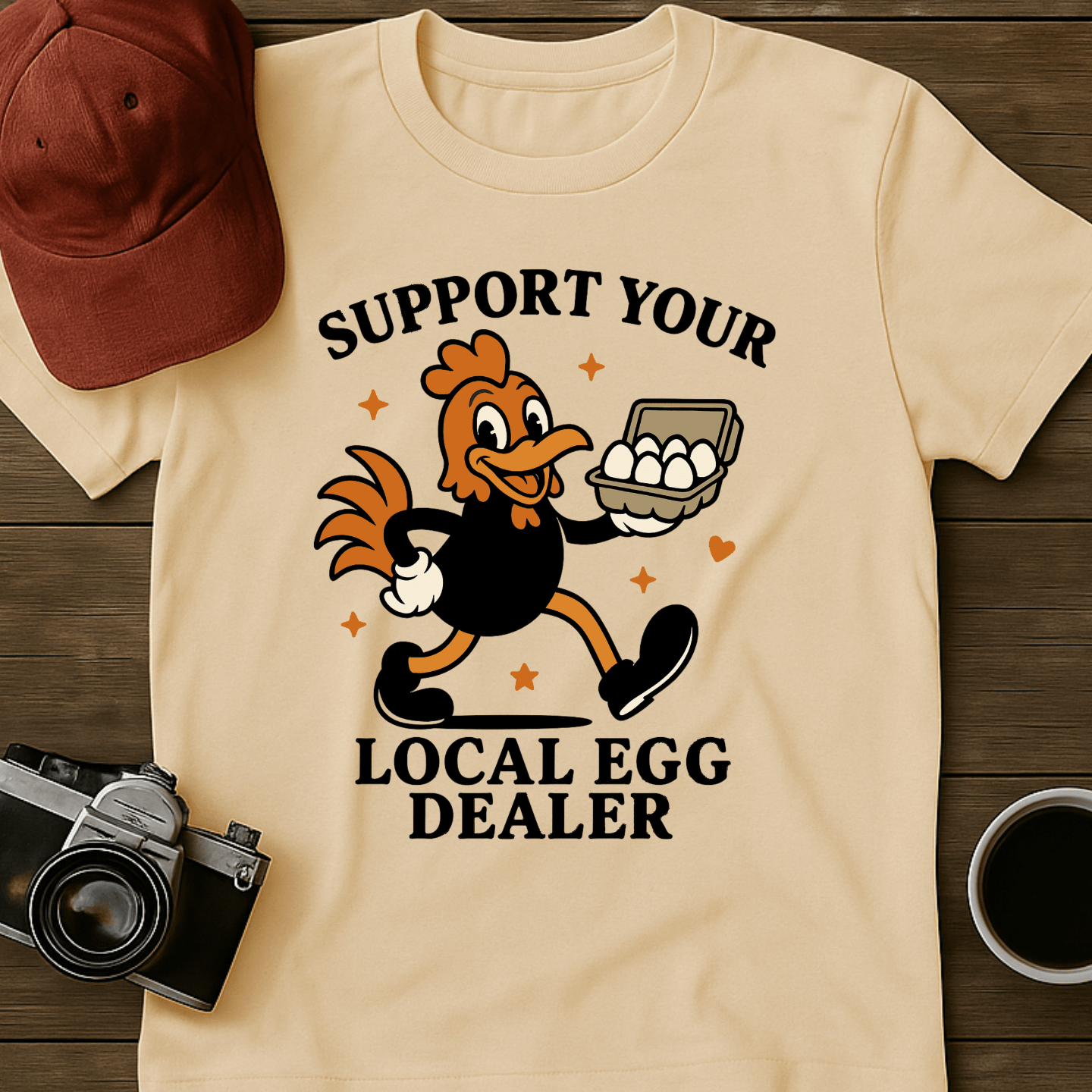 "Support Egg Dealer III T-Shirt" is a Rooted & Worn original design printed on a premium "softstyle" tee celebrating the simple joys of raising chickens.